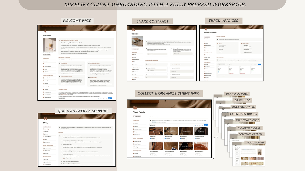 Client Onboarding Template: Kickstart success with a structured welcome page, secure client contract sharing, easy invoice tracking (invoice template), and comprehensive FAQs. Smooth client onboarding starts here.