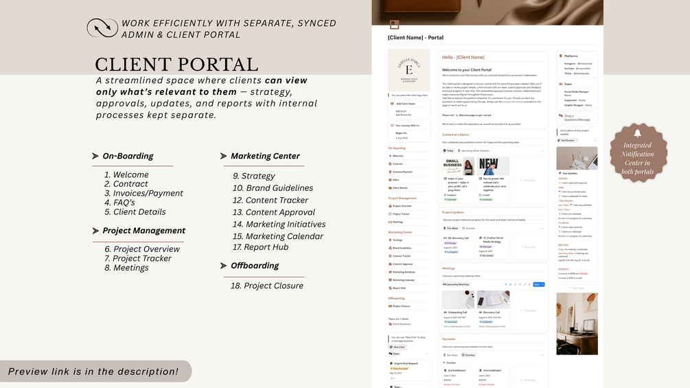 Are you a social media manager or media agency looking to transform your client relationships and streamline your workflow? This Ultimate Notion Admin & Client Portal is your all-in-one solution for seamless social media management, designed to elevate your client experience from onboarding to project closure and empower your team with a centralized workspace.