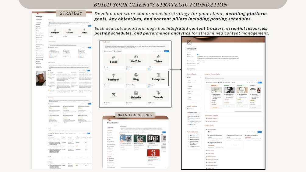 - 9 Social Media Platform Pages (Instagram, TikTok, Facebook, LinkedIn, YouTube, X, Threads, Email, Blog)