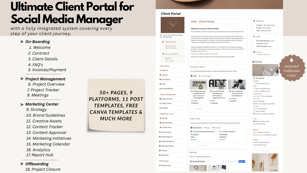 Are you a social media manager or media agency looking to transform your client relationships and streamline your workflow? This Ultimate Notion Client Portal is your all-in-one solution for seamless social media management, designed to elevate your client experience from client onboarding to project closure.