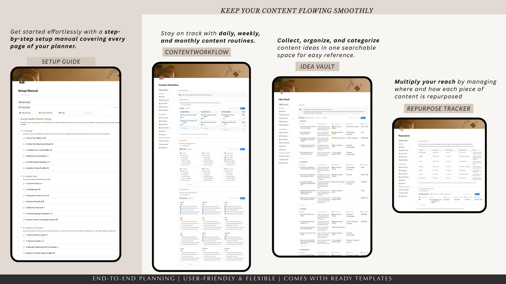 - Ideal for anyone looking to elevate their social presence with a comprehensive social media planner built inside Notion